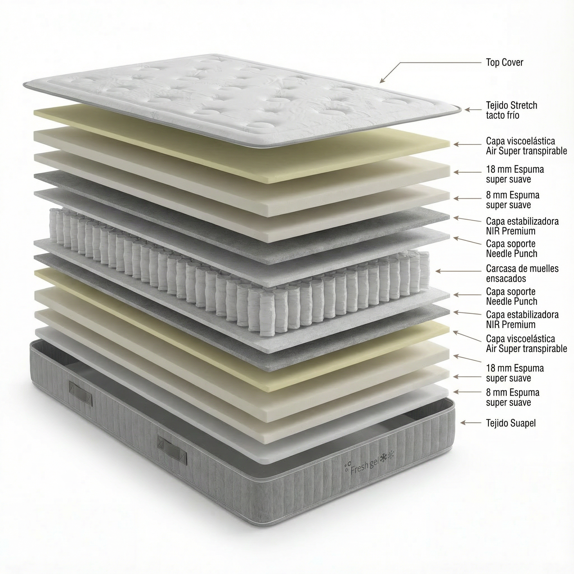 El Fresh Supreme está diseñado para quienes pasan calor al dormir. Gracias a su núcleo de muelles ensacados y sus capas de viscoelástica Air transpirable, el aire circula constantemente dentro del colchón, evitando acumulación de calor y humedad.